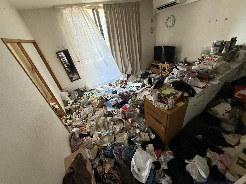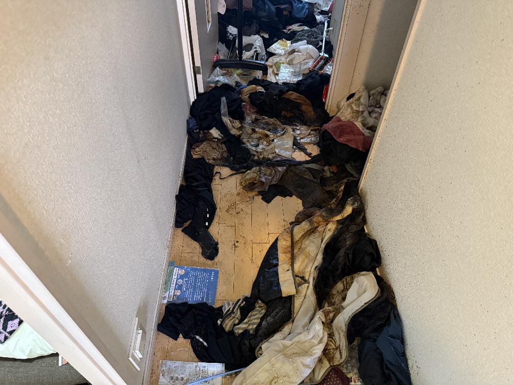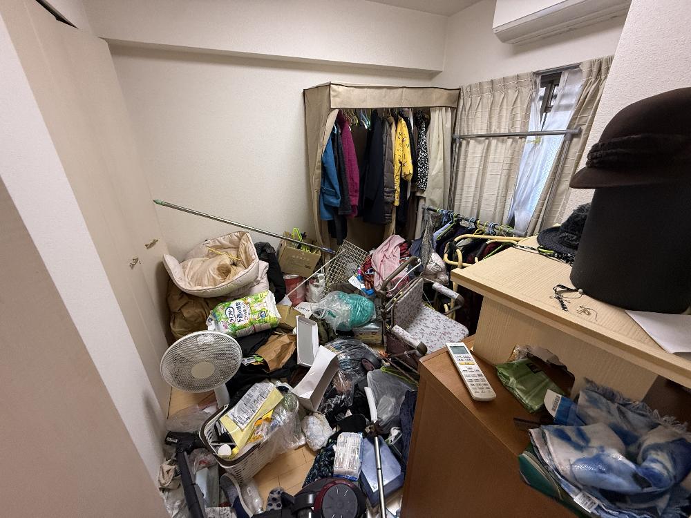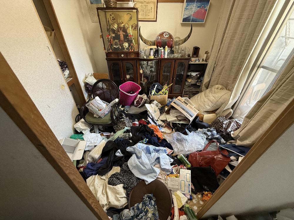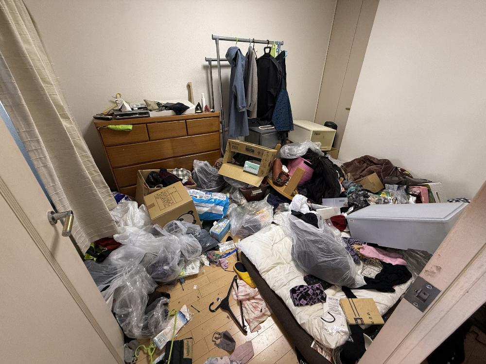 現地を確認させていただいたところ、お部屋はゴミ屋敷状態となっており、生活用品や日用品、容器類、紙類などが床一面に積み重なっている状況でした。通路の確保も難しく、まずは安全に作業ができるスペースを作るところから開始しました。