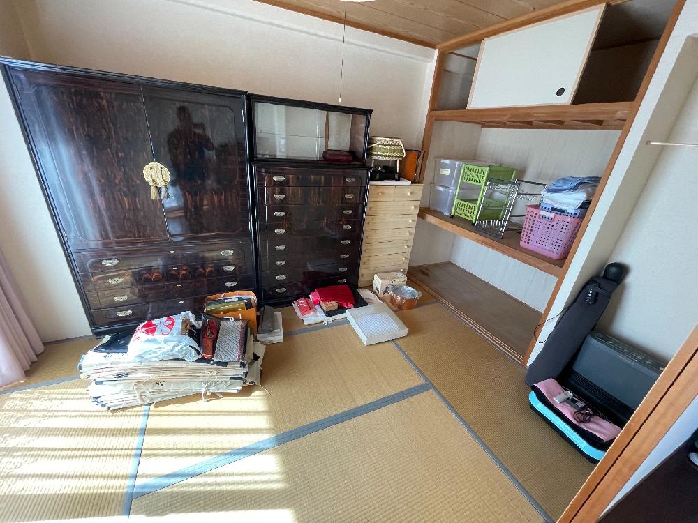 今回のお部屋には、大型のタンスや婚礼家具、食器棚など、しっかりとした造りの家具が多くありました。昔の家具は特に重量があるものが多く、ご自身での移動や処分が難しい場合も少なくありません。そのため、まずは搬出経路の確認を行い、安全に作業できる方法を検討しました。