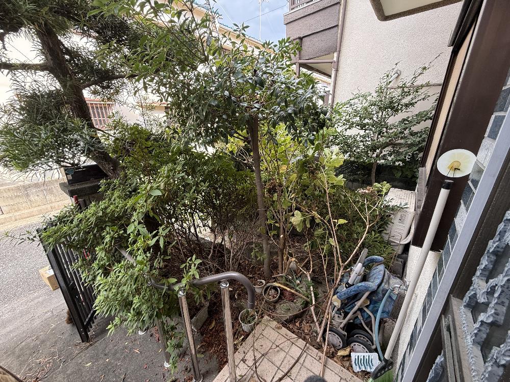 一軒家ということもあり、室内の遺品整理に加えて、お庭の手入れも必要な状態でした。特に庭木が大きく成長しており、隣接する敷地への影響も考慮しながら、伐採作業も同時に実施いたしました。