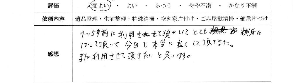 以前利用していただいたお客様から遺品整理の見積もりの依頼をいただき即日で対応させていただきました。