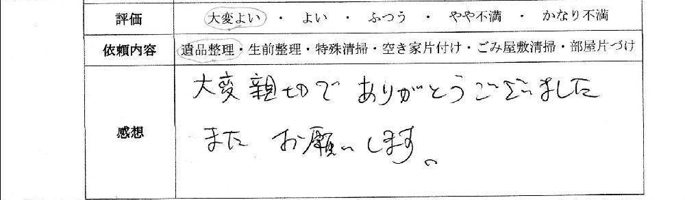 以前当社をご利用いただいたお客様からご実家の遺品整理の見積もりの依頼をいただき即日で対応させていただきました。