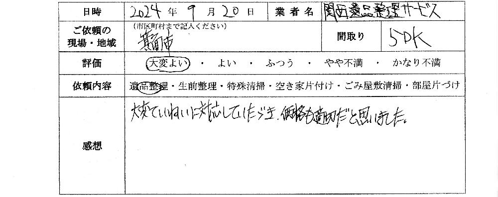 箕面市で遺品整理を利用されたお客様の事例|作業事例・お客様の声|関西遺品整理サービス